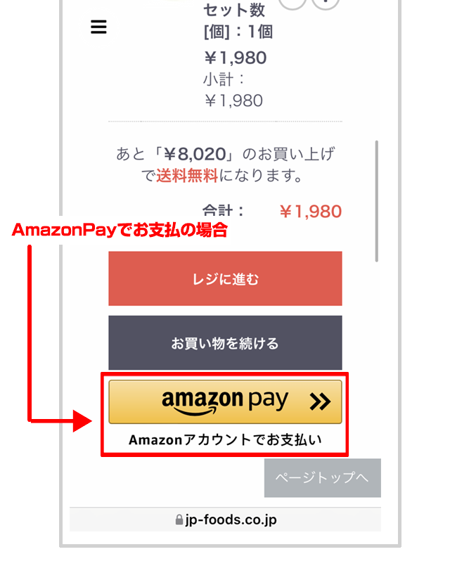 1. カート画面で黄色の「amazon pay」ボタンを押します。